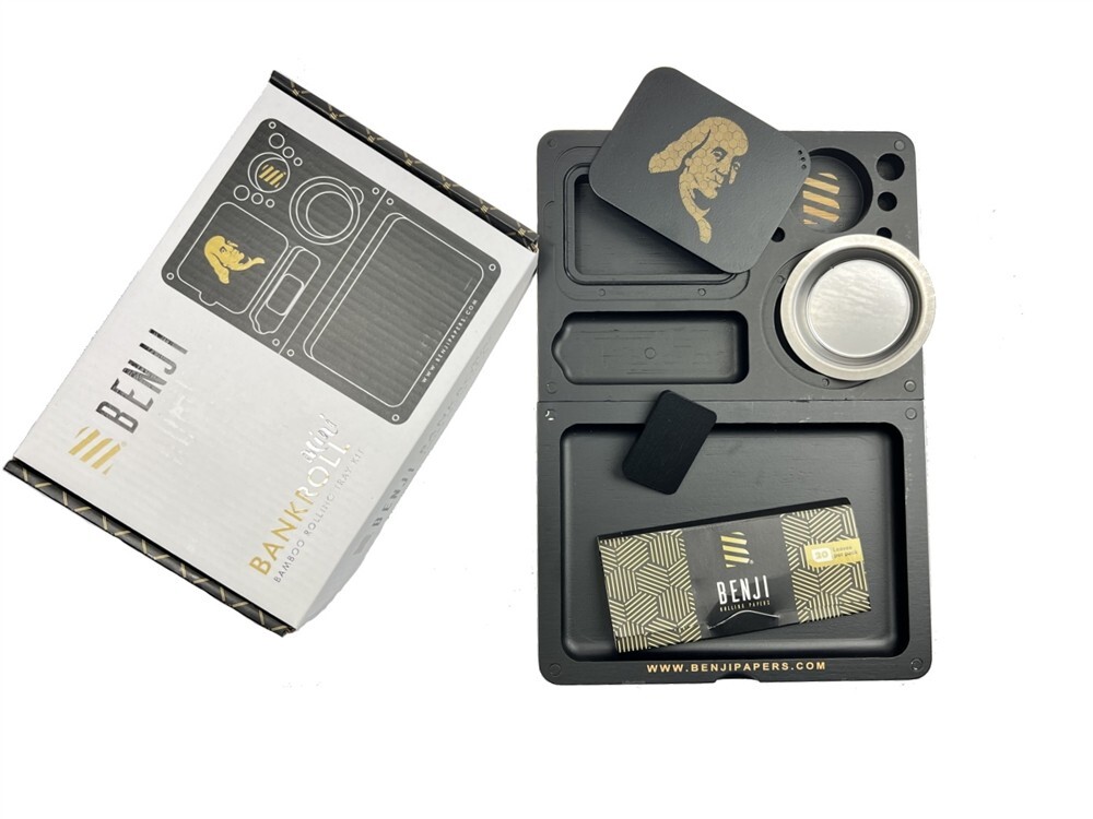 • 綜合套件:Benji Bankroll 套件包括托盤、一本包含 Benji 100 美元印刷紙的捲菸紙、一個鏟子和一個煙灰缸,提供無縫滾動體驗所需的一切。