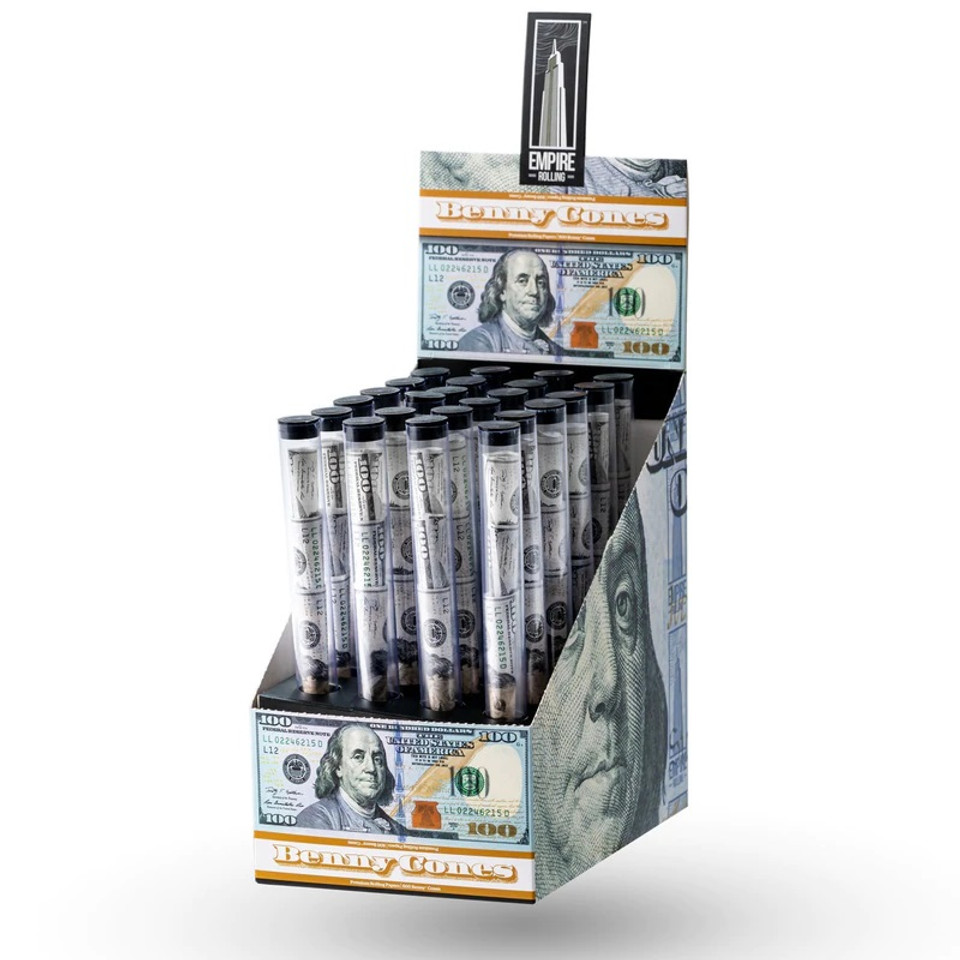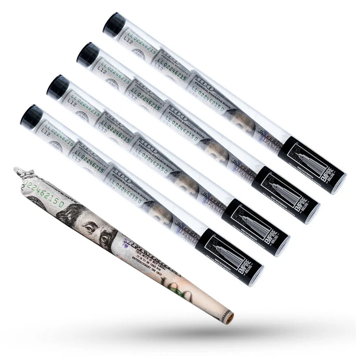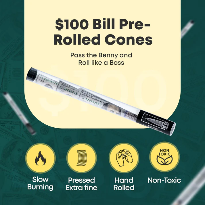 用Empire Rolling – Benny Cones 預捲菸筒,將標誌性的 100 美元鈔票風格帶到您的下一場雪茄派對上。